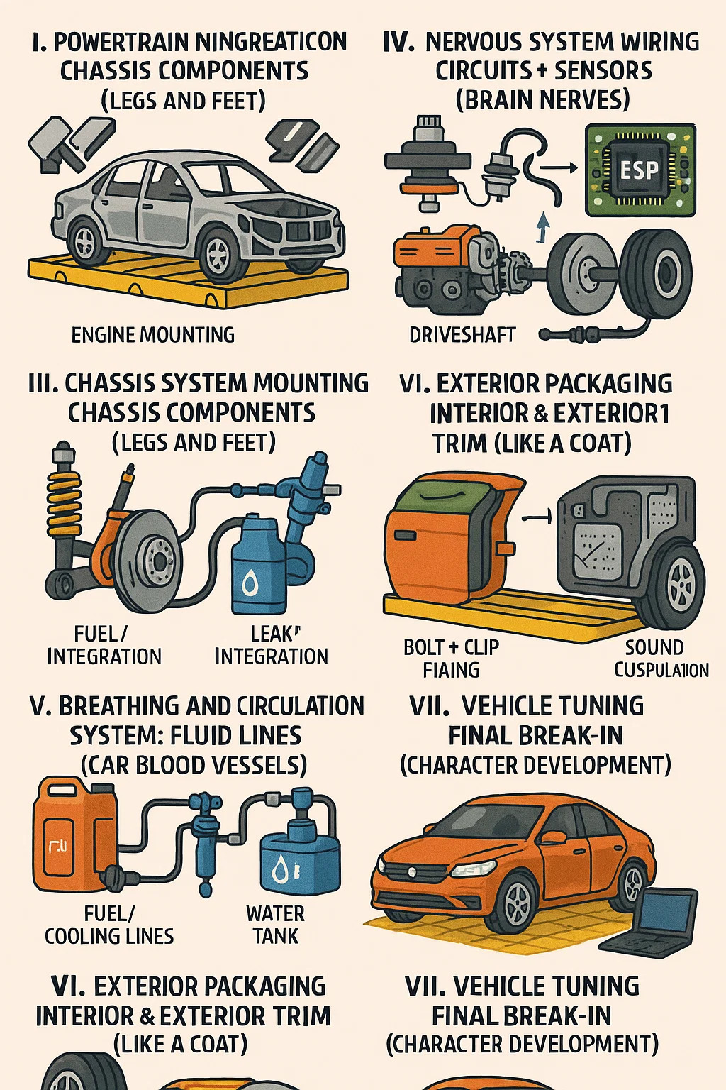 خطوط سوخت/خنک کننده: مخزن سوخت → پمپ بنزین → انژکتورهای سوخت یک "کانال تامین سوخت" را تشکیل می دهند، در حالی که مخزن آب → پمپ آب → بلوک موتور یک "چای خنک کننده" را تشکیل می دهد.