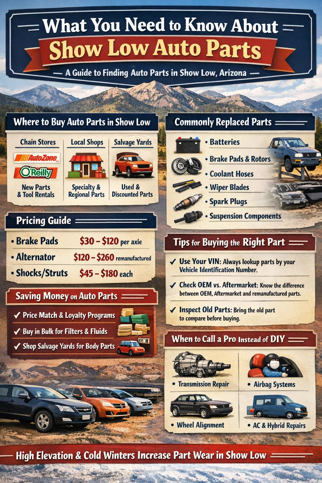 برای اکثر تعمیرات روزانه راننده در Show Low، یک قطعه خودرو با کیفیت پس از فروش یا بازسازی شده تعادل مناسبی بین هزینه و قابلیت اطمینان است. OEM را برای قطعات ایمنی حیاتی یا خودروهایی که هنوز تحت ضمانت هستند، ذخیره کنید، جایی که قطعات غیر OEM می توانند ادعاهای گارانتی را پیچیده کنند.