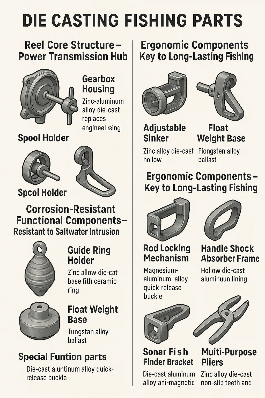 قطعات ماهیگیری ریخته گری اجزای فلزی هسته ای هستند که با استفاده از یک فرآیند ریخته گری با فشار بالا تولید می شوند. آنها به نیازهای اصلی مقابله با ماهیگیری مانند سبک وزن ، مقاومت در برابر خوردگی و قابلیت اطمینان عملکردی می پردازند. برنامه ها و ویژگی های کلیدی به شرح زیر است: